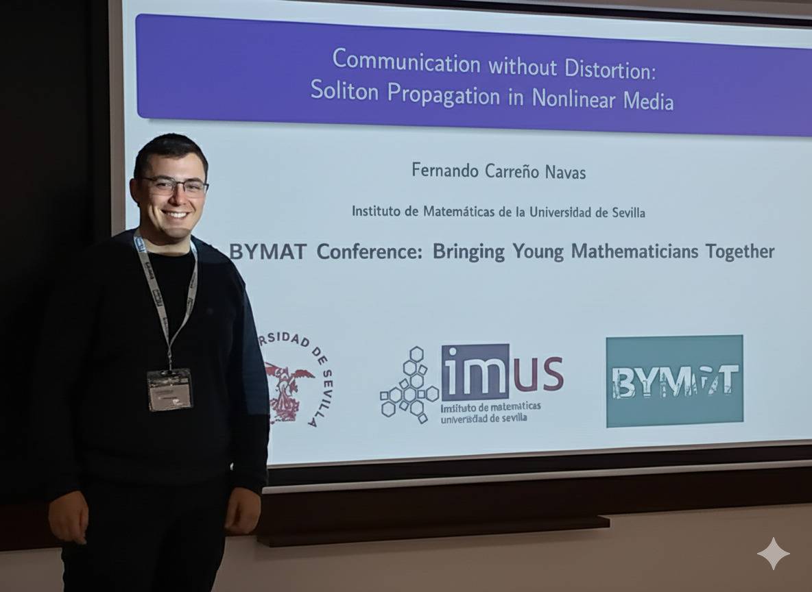 Fernando Carreño Navas impartiendo la charla Communication without Distortion: Soliton Propagation in Nonlinear Media el 19 de noviembre de 2025 en la 7th BYMAT Conference: Bringing Young Mathematicians Together. (descarga las transparencias pinchando AQUÍ.